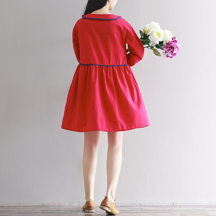 秋款女裝森女范寬松娃娃領棉麻中長款蝴蝶結系帶連衣裙長袖S4677